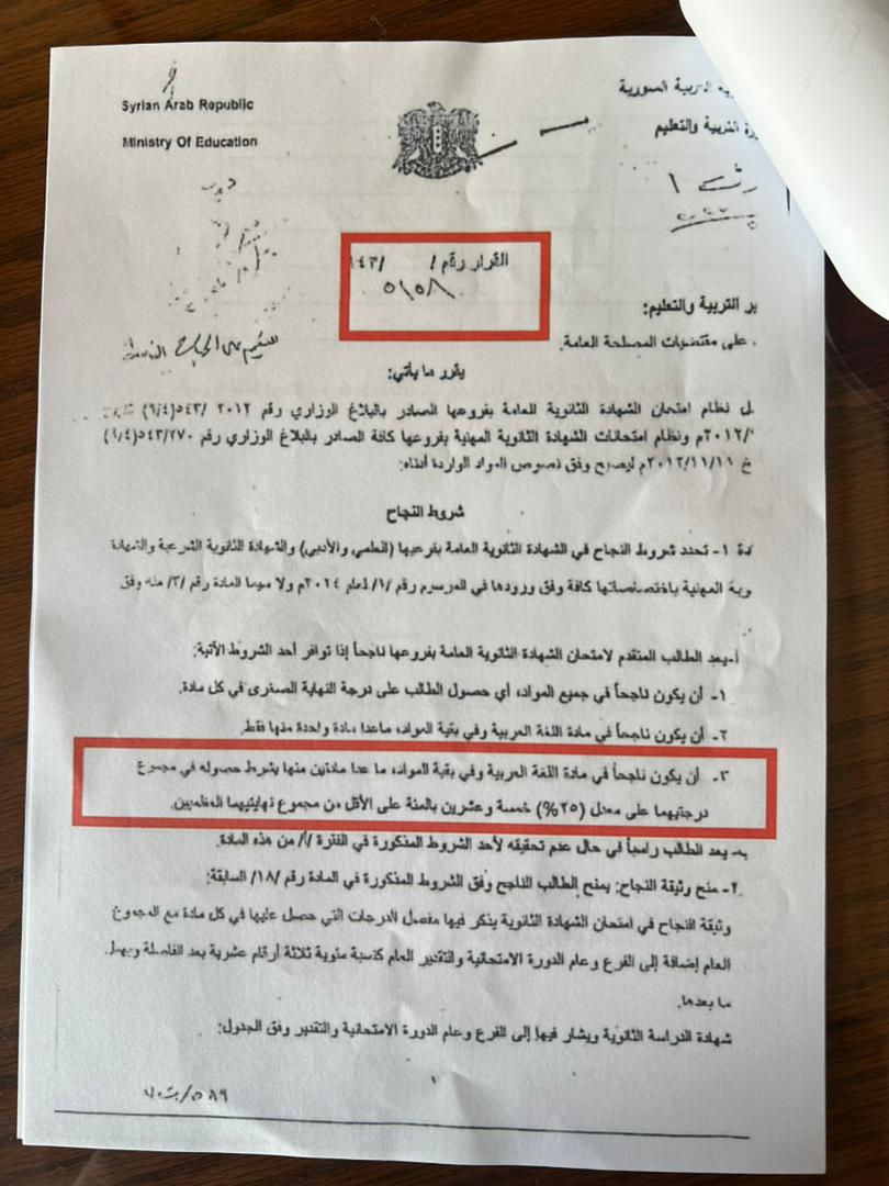 ١. حدوث أخطاء في التعامل مع معايير النجاح المتبعة في الثانويات المهنية و التي حددها المرسوم رقم ١ لعام ٢٠٢٤ و الذي ألغي بموجبه نظام الامتحان المتبع من دورتين إلى دورة واحدة و تغيرت فيه معايير النجاح وفقاً لذلك ، و بناءً عليه وجدنا أنه بقي العديد من أبنائنا راسبون رغم تحقيقهم لمعايير النجاح ( الرسوب في مادتين و الحصول على ٢٥٪ من علامة النجاح في مجموع درجتيهما من مجموع درجتيهما العظميين ) علماً أنه عند المراجعات المتكررة من قبل العديد من الطلاب و أهاليهم للجهات و اللجان المسؤولة عن تنظيم الامتحان و تطبيق معايير النجاح ؛ كان الجواب أن هناك تغييراً في معيار النجاح عند الرسوب في مادتين إلى ٣٠٪ من مجموع المادتين بدلاً من ٢٥ ٪ ، لكننا نجد في الوقت نفسه أن ذلك مخالف للمرسوم الجمهوري رقم ١ لعام ٢٠٢٤ و الذي نعلم أن تغييره يحتاج لمرسوم مخالف له و ليس عبر قرارات داخلية فقط ، مع التنويه إلى أن هيئة المنافذ البرية و البحرية قد عمّمت القرار الذي حدد معايير النجاح الذي أرسلته وزارة التربية بالقرار رقم ٩٤٣/٥١٥٨ منذ تاريخ ١ / ٦ / ٢٠٢٥ على الطلاب في الثانويتين في طرطوس و اللاذقية قبل التقدم للامتحانات و تقدّم الطلاب وفقه لامتحاناتهم لكن اللجان خالفته عند إصدار النتائج .