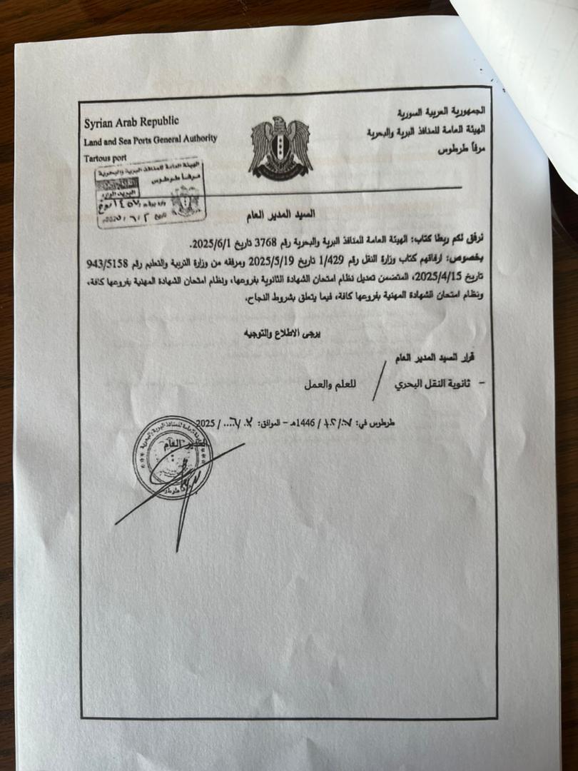 يقول الاهالي:تقدم اولادنا كباقي زملائهم لامتحان الشهادة الثانوية للنقل البحري للعام الدراسي ٢٠٢٤ /٢٠٢٥ و صدرت النتائج متأخرةً عن الأعوام الماضية بعدما شهدته البلاد من ظروف ما بعد التحرير و سقوط النظام البائد ، ملتزمين بجميع التعاميم و القرارات و أهمها القرار رقم ٩٤٣/٥١٥٨ تاريخ ١٥ / ٤ / ٢٠٢٥ و الذي صدر كتعليمات تنفيذية للمرسوم رقم ١ لعام ٢٠٢٤ و الذي تمّ بموجبه تعديل نظام الامتحانات من دورتين إلى دورة واحدة و وحددت وفق المادة ٢ من المرسوم نفسه أسس و معايير النجاح في جميع الثانويات بفروعها كافة ، و إذ نجد أن جميع الثانويات المهنية في الجمهورية العربية السورية تتبع القانون رقم ٣٨ لعام ٢٠٢١ و الذي تم إحداث الثانويات المهنية بموجبه كتعديل لمرسوم سابق و أكد في مادته رقم ٣ أن الثانويات المهنية تتبع في قراراتها تعليمات وزارة التربية في مناهجها و امتحاناتها و أن نظام الامتحانات موحد يحدد بقرار من وزير التربية بالتنسيق مع الوزير المختص ، و وفقاً لذلك ننوه أنه و بعد صدور النتائج تبين لنا ما يلي :