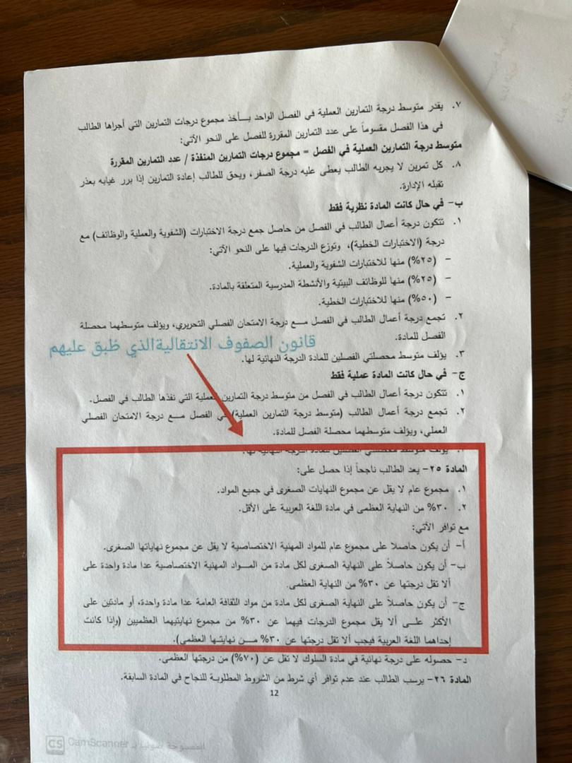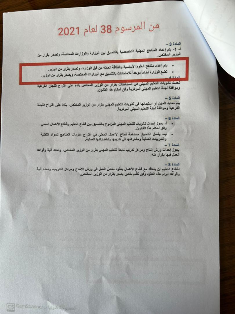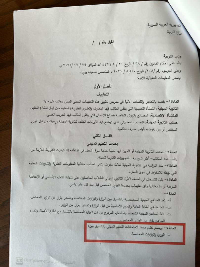 صورة عن قرار وزارة التربية رقم ٩٤٣/٥١٥٨-صورة عن تعميم هيئة المنافذ البرية و البحرية لقرار وزارة التربية-صورة عن المادة ٣ من المرسوم التشريعي ٣٨ لعام ٢٠٢١-صورة عن المادة رقم ٦ من التعليمات التنفيذية للمرسوم التشريعي ٣٨ لعام ٢٠٢١-صورة عن المادة المنظمة لامتحانات الصفوف الانتقالية وفق للنظام الداخلي للثانويات المهنية