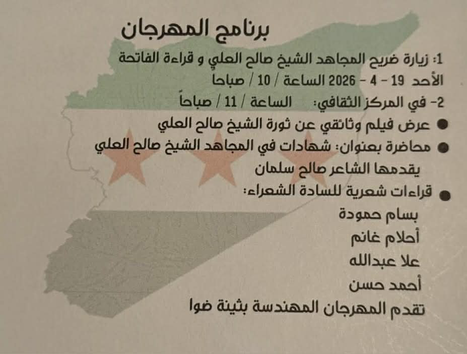 والدعوة عامة لحضور فعاليات المهرجان المقررة بعد غد الاحد 19-4-2026 في مدينة الشيخ بدر بدءًا من الساعة العاشرة صباحاً وفق البرنامج المرفق