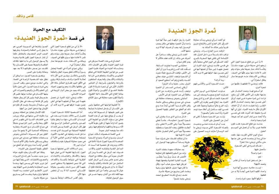 المفتاح في قصة “ثمرة الجوز العنيدة “للأديب مفيد عيسى احمد لم يكن في ثمرة الجوز العنيدة، ولكن في الإنسان ذاته وممارساته العنيدة مع الحياة، فثمرة الجوز تعبر عن قوانين الطبيعة الثابتة التي تحكم المقاييس والأبعاد، وتتحكم في الزراعة والنباتات والأشجار، وكما يعرف المشتغلون بالزراعة، والعارفون بأسرارها أن التباشير الإثمار الأول في أي شجرة مثمرة لا تكون مكتملة النضع أو التكوين، وأحياناً تكون بمثابة اللقاح في الأشجار ذاتية التلقيح وأحياناً تكون مجرد محاولة في سبيل الإنتاج (الإثمار).