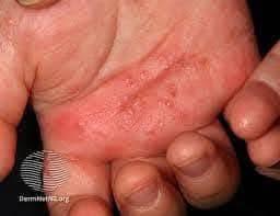 وعند الأطفال أقل من ٢ سنة من العمر تأخذ الاندفاعات شكلاً حويصلياً عادة وتنتشر إضافة لما سبق في الفروة والوجه والعنق والراحتين والأخمصين.