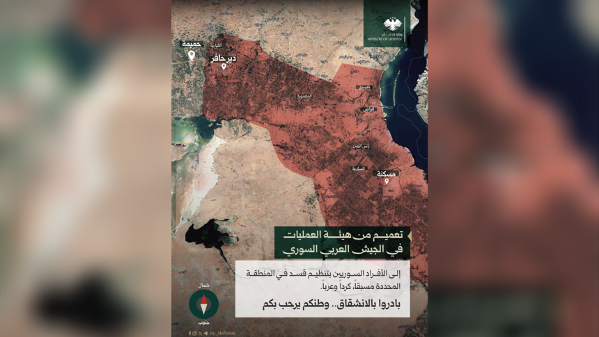 وتتابع قوات الجيش العربي السوري التقدم ودخول المناطق دون استهداف عناصر وآليات تنظيم قسد، وفق ما أعلنت هيئة العمليات أمس إثر إعلان تنظيم قسد انسحاب قواته من منطقة غرب الفرات بدءاً من الساعة السابعة صباح اليوم.