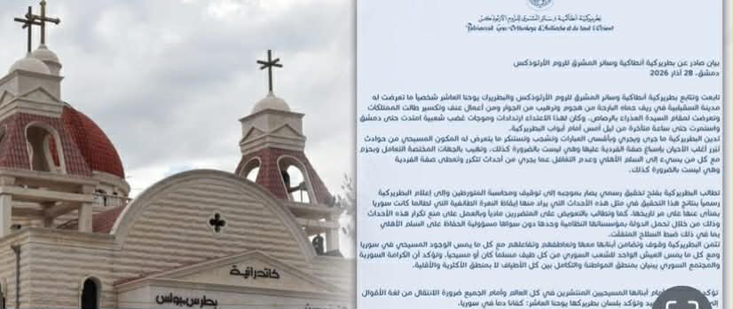 بطريركية أنطاكية وسائر المشرق للروم الأرثوذكس:ندين ونستنكر ماتعرضت له مدينة السقيلبية ونطالب بفتح تحقيق رسمي يصار بموجبه إلى توقيف ومحاسبة المتورطين والتعويض على المتضررين