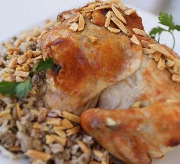 6. ضعي الدجاجة بصينية الفرن وصبي ما مقداره كوب من الماء على جوانب الدجاجة وأدخليها للفرن لمدة ساعتين. وحين النضوج انقليها على طبق التقديم وضعي كمية من أرز الحشوة المفلفل وزيني بحبات اللوز المقلي.