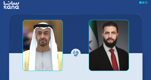 وأكد الرئيس الشرع تضامن الجمهورية العربية السورية مع دولة الإمارات العربية المتحدة حيال الاعتداءات التي استهدفت أراضيها وعدداً من الدول الشقيقة، مشدداً على موقف سوريا الثابت برفض أي انتهاك لسيادة الدول العربية أو المساس بأمنها واستقرارها تحت أي ذريعة.