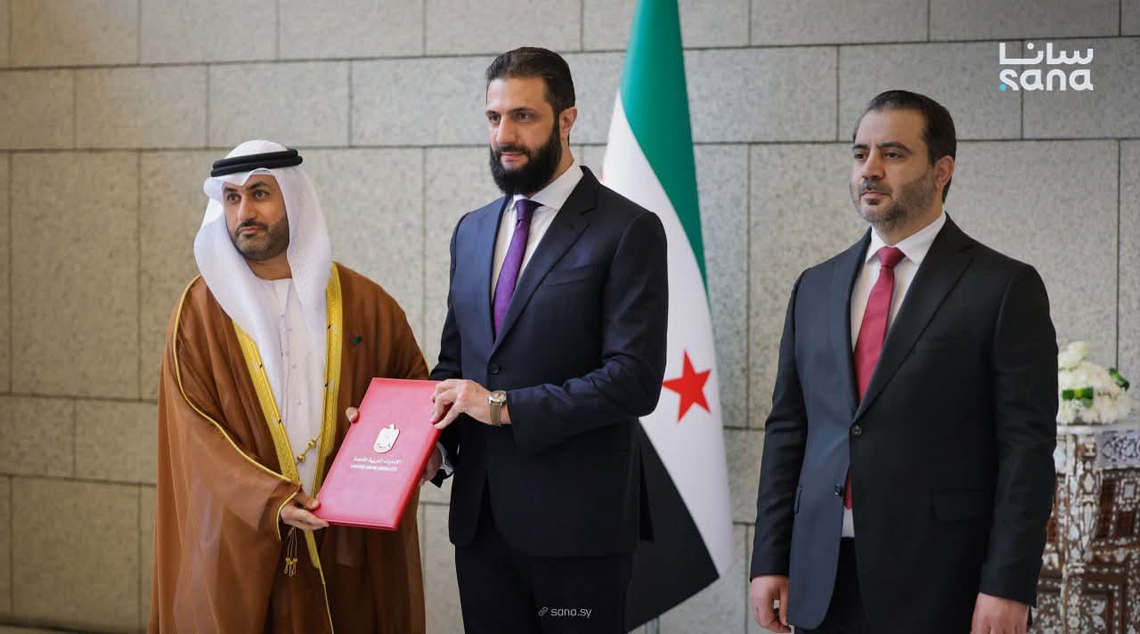 تقبل الرئيس أحمد الشرع، اليوم أوراق اعتماد السفير حمد راشد بن علوان الحبسي، سفير دولة الإمارات العربية المتحدة لدى الجمهورية العربية السورية