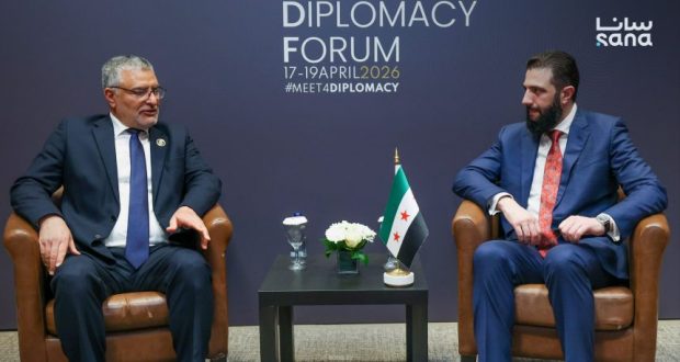 اجتمع الرئيس أحمد الشرع مع رئيس المجلس الأعلى للدولة الليبية محمد تكالة، بحضور وزير الخارجية أسعد حسن الشيباني ورئيس الاستخبارات العامة حسين السلامة، على هامش أعمال منتدى أنطاليا الدبلوماسي.