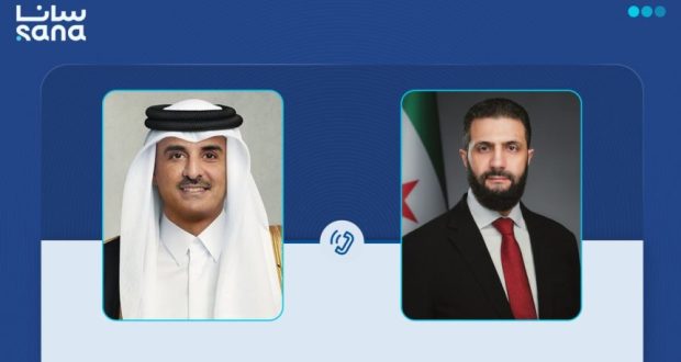 أجرى السيد الرئيس أحمد الشرع اليوم السبت اتصالاً هاتفياً مع صاحب السمو الشيخ تميم بن حمد آل ثاني أمير دولة قطر، لبحث التطورات المرتبطة بالتصعيد بين الولايات المتحدة وإسرائيل وإيران وانعكاساته على أمن واستقرار المنطقة.