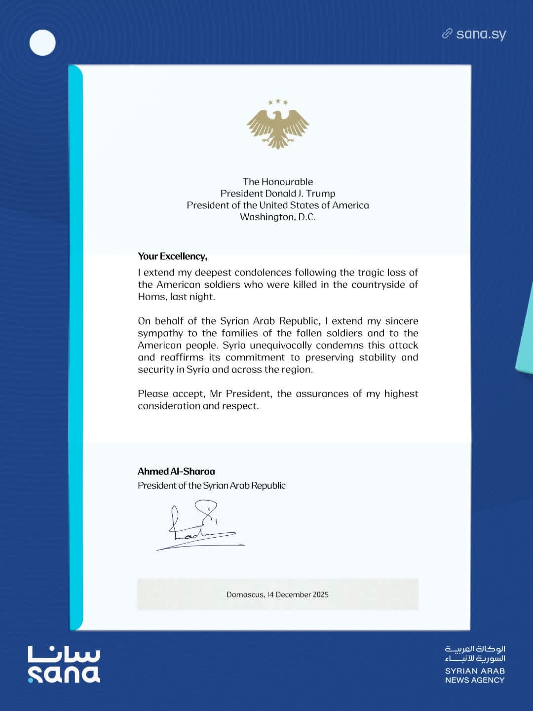 بعث رئيس الجمهورية العربية السورية أحمد الشرع برقية تعزية إلى الرئيس الأمريكي دونالد ترامب، أعرب فيها عن أحرّ التعازي والمواساة إثر الهجوم الإرهابي الذي أودى بحياة عدد من الجنود الأمريكيين في ريف حمص الليلة الماضية.