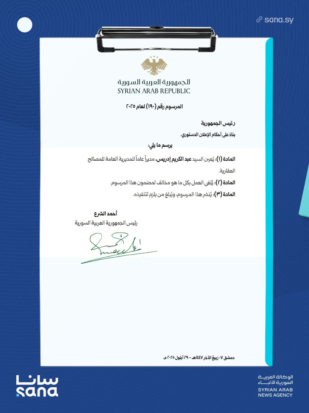 كما أصدر المرسوم رقم (190) لعام 2025، القاضي بتعيين عبد الكريم إدريس مديراً عاماً للمديرية العامة للمصالح العقارية.