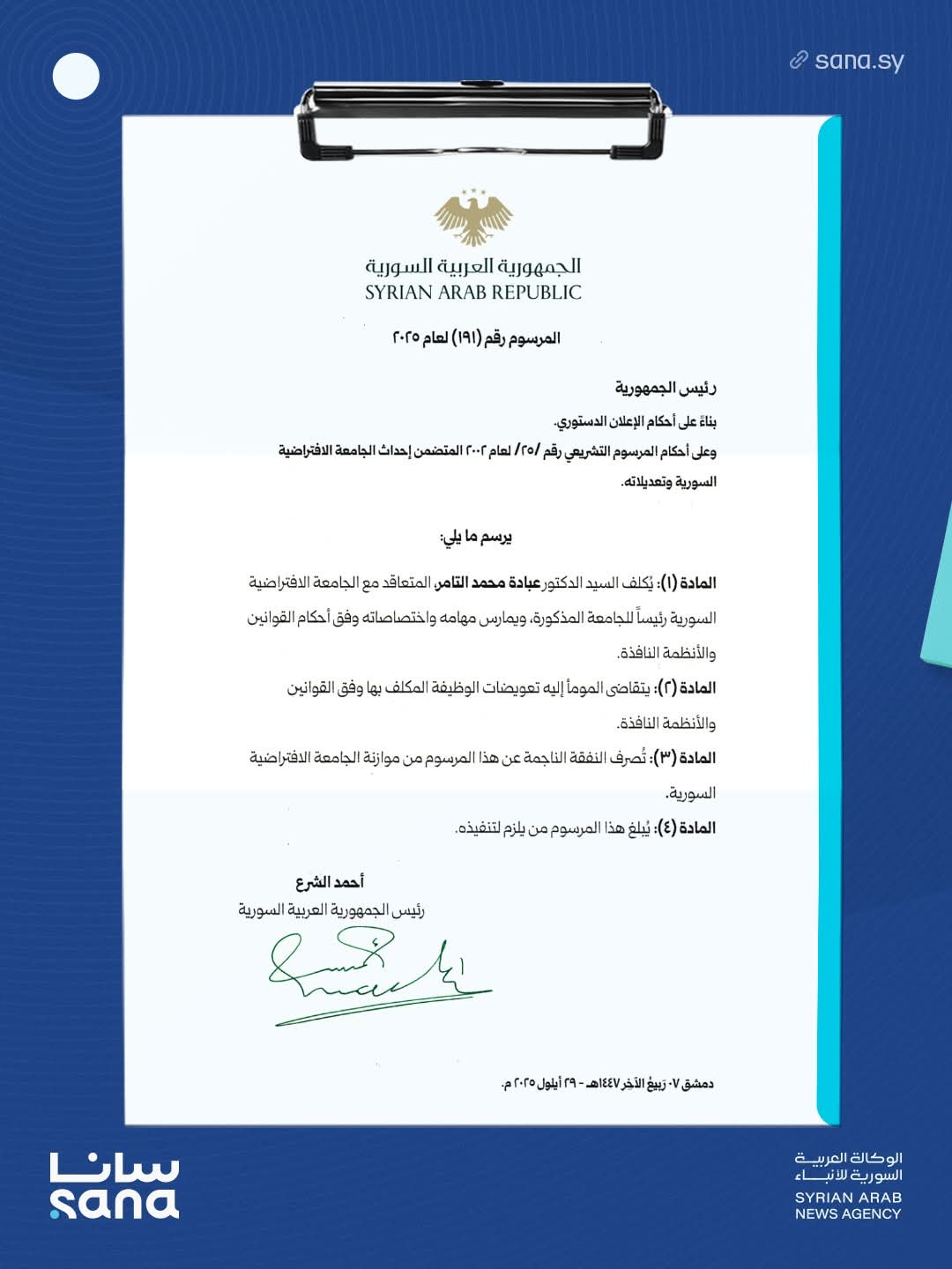 والمرسوم رقم (191) لعام 2025، القاضي بتكليف الدكتور عبادة محمد التامر رئيساً للجامعة الافتراضية السورية.