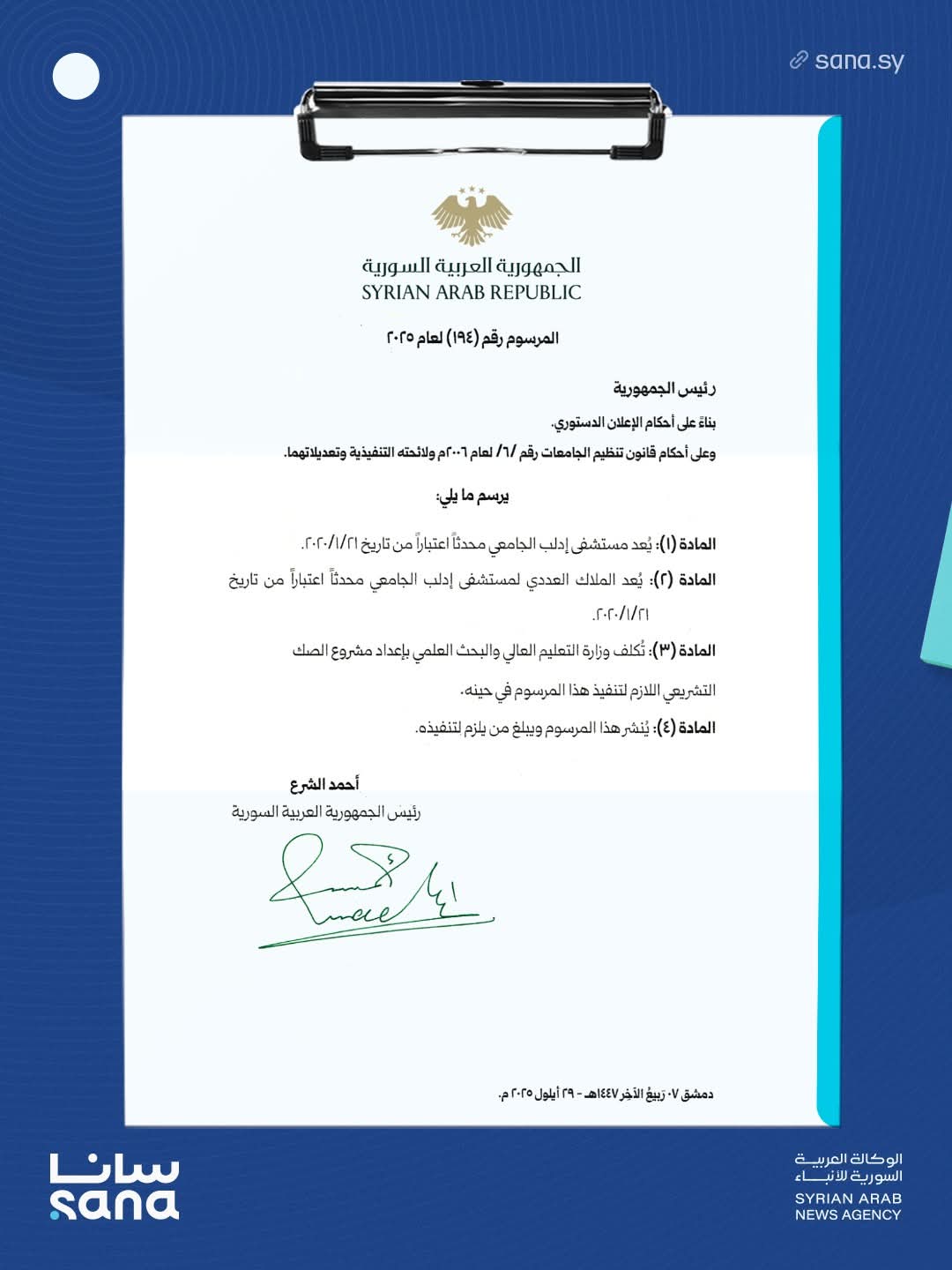 وأصدر المرسوم رقم (193) لعام 2025، القاضي باعتبار جامعة إدلب محدثة من تاريخ 2-8-2015.