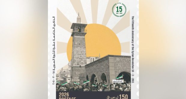 أصدرت المؤسسة السورية للبريد، اليوم الأربعاء، أول طابع بريدي تذكاري بمناسبة الذكرى الـ 15 لانطلاق الثورة السورية.