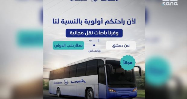 أعلنت الخطوط الجوية السورية عن توفير خدمة نقل مجانية من مدينة دمشق إلى مطار حلب الدولي للمسافرين المقيمين والذين لديهم تذاكر سفر صادرة عن الشركة حصراً من المطار إلى مختلف الوجهات الخارجية التي تُسيّرها السورية للطيران.