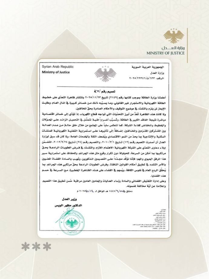 شدّدت وزارة العدل السورية على ضرورة إعطاء دعاوى التعدي على الشبكة الكهربائية الاهتمام اللازم، والعمل على فرض عقوبات رادعة بحق مرتكبيها بأسرع وقت ممكن، لمنع تكرار هذه الجرائم، حفاظاً على استمرارية هذا المرفق الحيوي والمهم.
