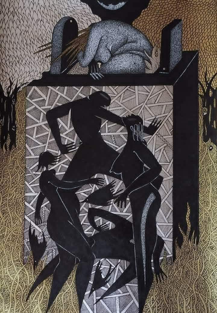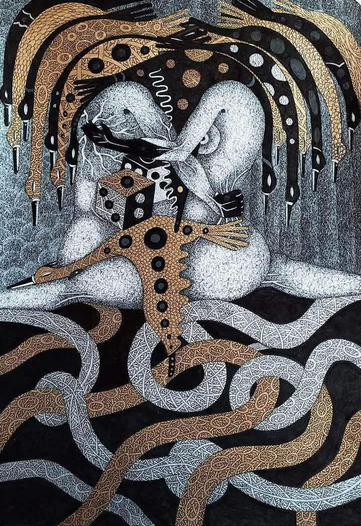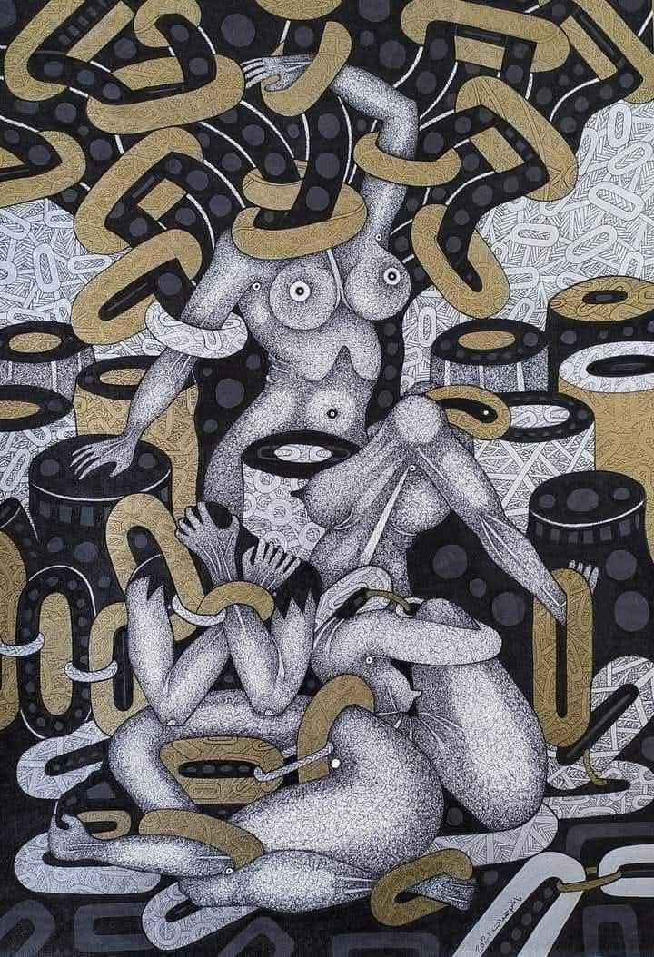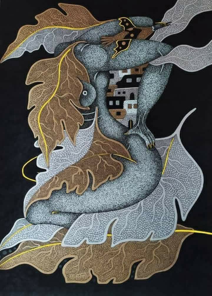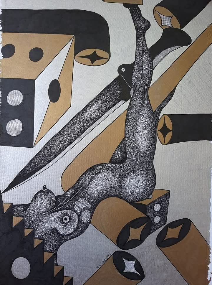 تعتمد تجربته اللونية على اقتصاد لوني واضح يهيمن عليه الاسود والذهبي والرمادي مع درجات ترابية خافتة وهو اختيار لا يبدو جماليا فحسب بل يحمل بعدا رمزيا يعكس صراعا دائما بين العتمة والنور وبين الاحتواء والتحرر حيث يعمل الذهبي كاشارة الى القيمة الداخلية او النور الكامن في الذات بينما يعزز الاسود الاحساس بالقلق والاحتباس الوجودي ضمن فضاء بصري خانق يحيط بالجسد ويخترقه في الوقت نفسه