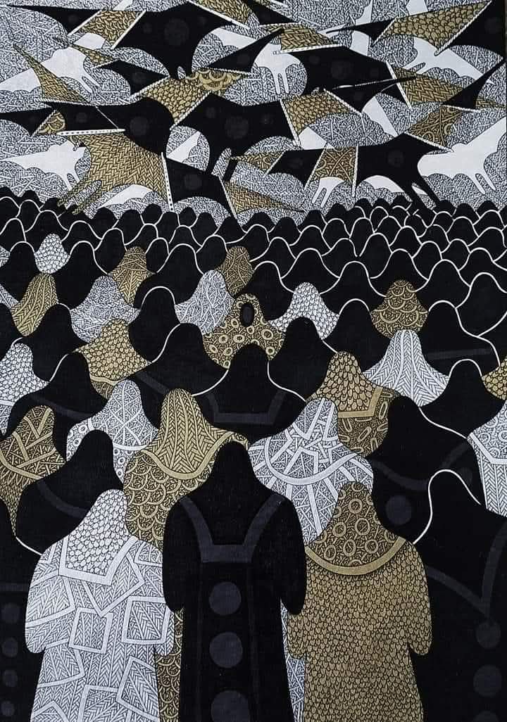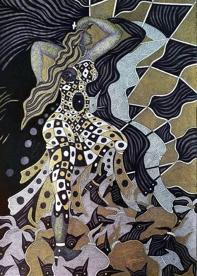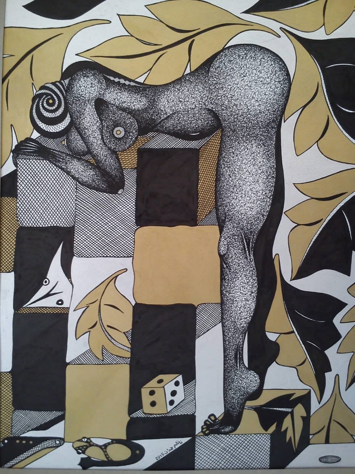 تقنيا يعتمد الفنان على بناء سطوح بصرية كثيفة قائمة على ملامس نقطية دقيقة وانماط زخرفية متكررة ذات ايقاع بصري متواصل يشبه النسيج او التطريز وهو اسلوب يمنح اعماله طابعا ملمسيا واضحا ويؤكد على وحدة التكوين وتماسكه حيث تتداخل العناصر ضمن كل عضوي واحد وتذوب الفواصل التقليدية بين الشكل والخلفية لتصبح اللوحة فضاء واحدا متشابكا يعكس الضغط النفسي والحركة الداخلية المستمرة