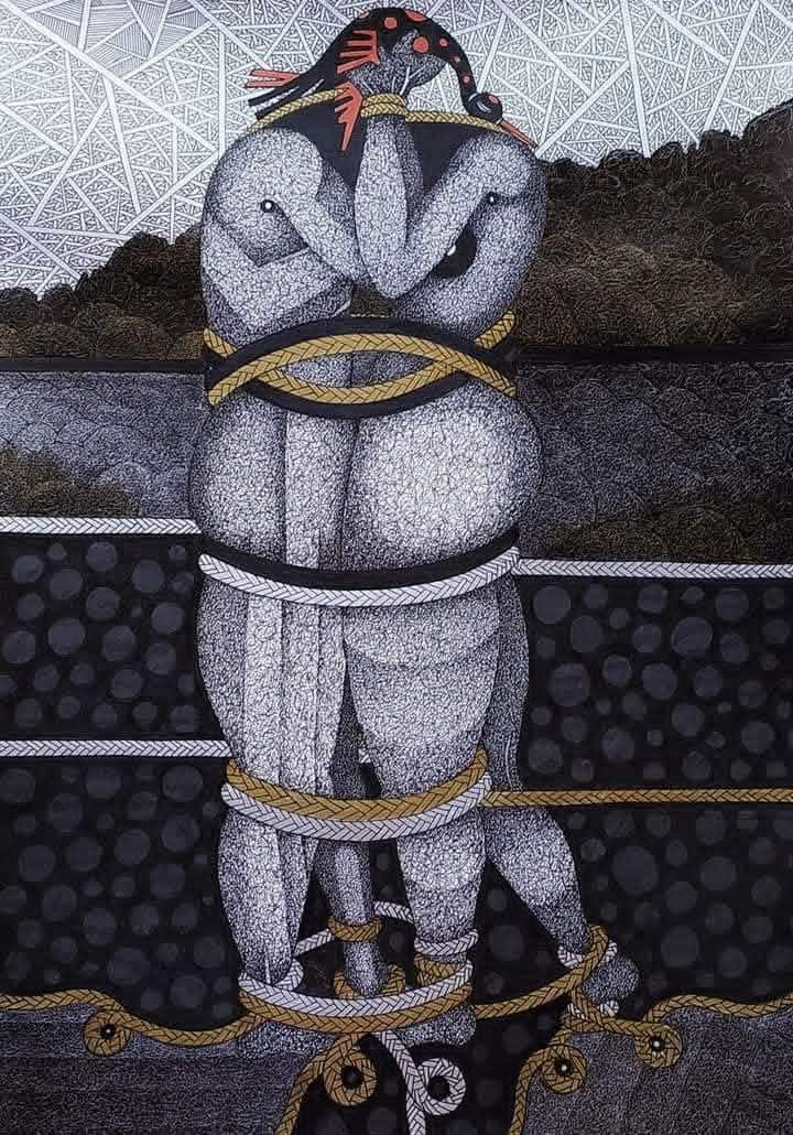 فلسفيا تطرح اعماله رؤية للهوية بوصفها حالة تشكل مستمر لا تستقر على صورة واحدة نهائية حيث يبدو الجسد في حالة تفكك واعادة تركيب دائمين في تعبير عن قلق وجودي واغتراب داخلي يعكس تجربة انسان معاصر محاصر بالتحولات والتناقضات وهو ما يجعل الجسد في اعماله موقعا للصراع بين الرغبة في السيطرة والتوق الى الحرية وبين الانتماء والانفصال عن العالم