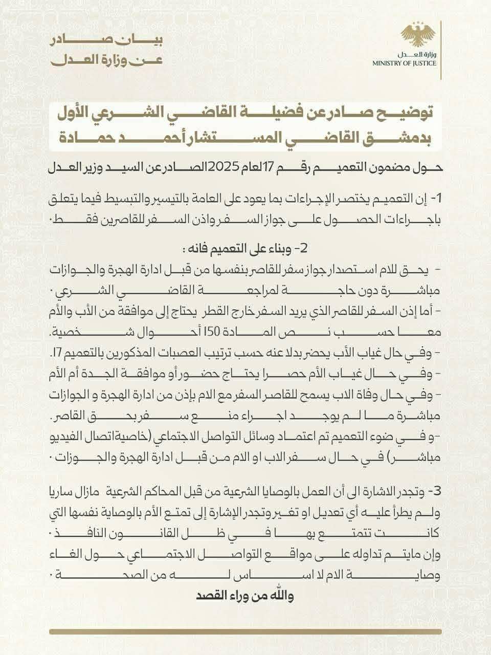 وبيّن أن التعميم يتيح للأم استصدار جواز سفر للقاصر مباشرة من إدارة الهجرة والجوازات دون مراجعة القاضي الشرعي، فيما يبقى إذن السفر إلى خارج البلاد مشروطاً بموافقة كل من الأب والأم معاً. وفي حال غياب الأب، يتم الرجوع إلى العصبات وفق الترتيب القانوني، أما في حال غياب الأم حصراً، فتُطلب موافقة الجدة (أم الأم).