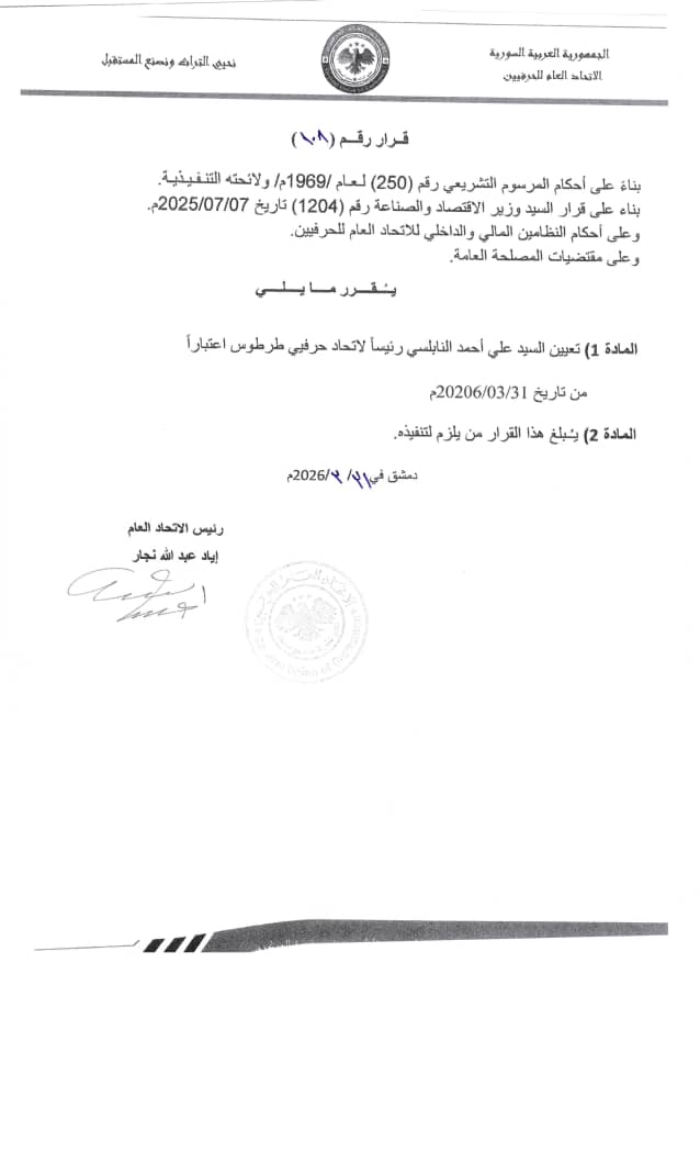 الاول تضمن تعيين السيد علي احمد النابلسي رئيساً لاتحاد حرفيي طرطوس