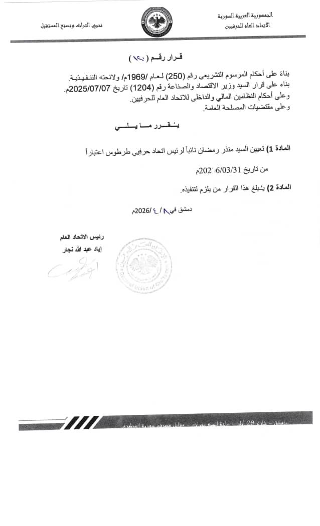 والثاني تضمن تعيين السيد منذر رمضان نائباً لرئيس اتحاد حرفيي طرطوس