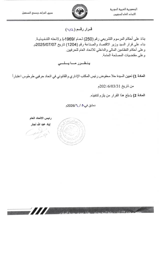 والثالث تضمن تعيين السيدة حلا محفوض رئيسة للمكتب الإداري والقانوني في اتحاد حرفيي طرطوس