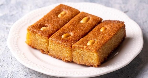 اتركي الهريسة حتى تبرد قليلاً وتتشرب القطر، ثم قدميها دافئة