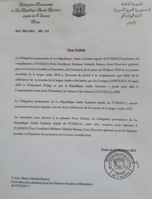 في 5 ك أول 2023 قامت سورية بتوجيه مذكرة شفهية خجولة الى اليونسكو تتمنى عليها فيها ان تتذكر في 18 ك اول 2023 ان فكرة يوم اللغة ذات بداية سورية في 15 اذار 2006., وانني مطلق الفكرة.