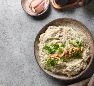 - ضعي بابا غنوج الباذنجان في طبق التقديم وزيّنيه بالبقدونس المفروم وحبات من الرمان والقليل من زيت زيتون، ثم قدميه.