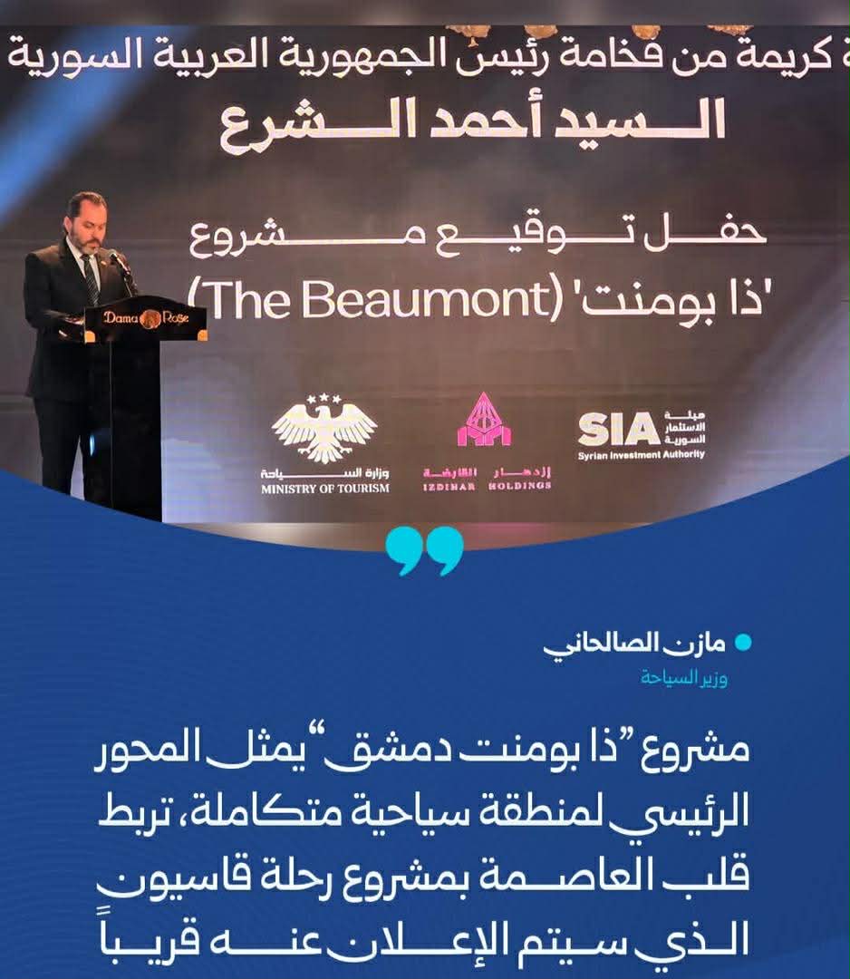 في كلمته اكد وزير السياحة ، “مازن الصالحاني”، أن المشروع يمثل محطة مفصلية في مسار تطوير القطاع السياحي في سوريا، ويجسد خطوة نوعية في جهود إعادة تنشيط القطاع السياحي وتعزيز جاذبية سوريا كوجهة استثمارية واعدة..