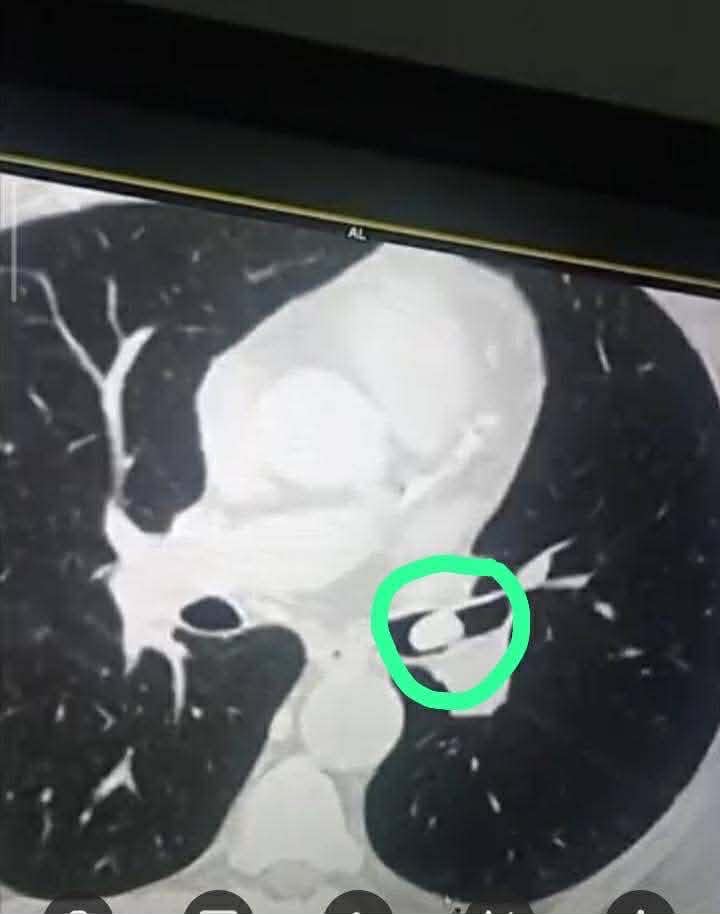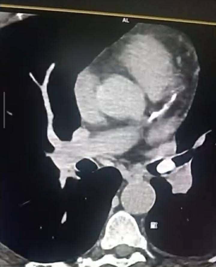 أُجري للمريض تنظير ليفي مرن لم يُظهر أي آفة على مستوى الحنجرة، فيما كشف الفحص السريري وجود وزيز في الجهة اليسرى من الصدر. وعلى ضوء ذلك، تم إجراء تصوير طبقي محوري للعنق والصدر .. أظهر وجود جسم أجنبي عالق بعد التفرع القصبي الأيسر مما سبب انسداداً جزئياً في القصبة اليسرى.