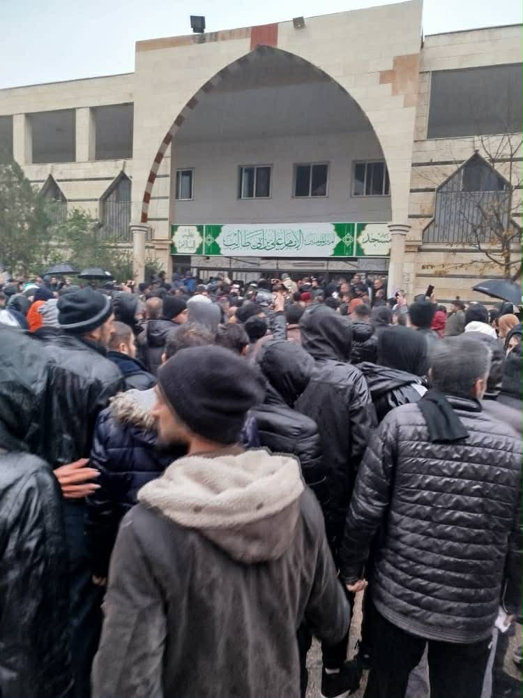 توافد حشد كبير من أبناء حمص ظهر اليوم إلى ساحة مسجد الإمام علي بن أبي طالب للمشاركة بتشييع جثامين الشهداء الذين ارتقوا نتيجة هذه الجريمة الارهابية