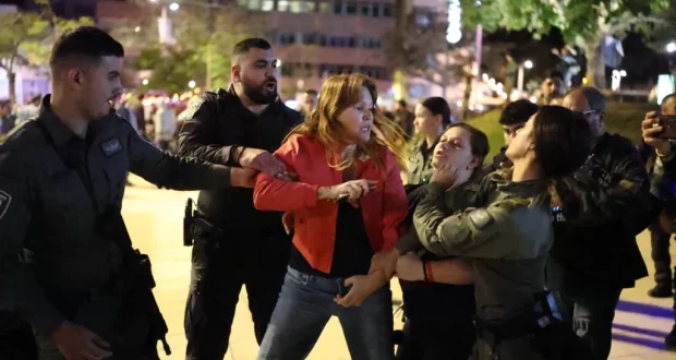 واعتُقل أشخاص عدة كما طُرح عدد من المتظاهرين أرضاً، وفق صحافيين في وكالة “فرانس برس” كانوا حاضرين خلال التجمّع الذي نُظّم في ساحة هابيما في تل أبيب بوسط إسرائيل.