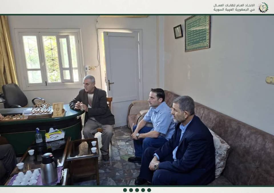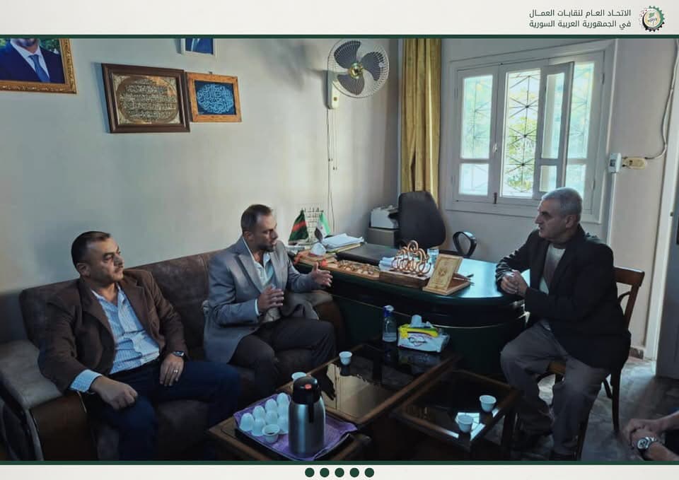 قام رئيس اتحاد عمال محافظة طرطوس أحمد صهيوني، يرافقه أعضاء المكتب التنفيذي في زيارتين منفصلتين إلى مطرانية طرطوس للروم الأرثوذكس والمجلس الإسلامي الإسماعيلي في طرطوس، في اطار أهمية توسيع الشراكات المجتمعية وتعزيز التنسيق لخدمة قضايا العمال
