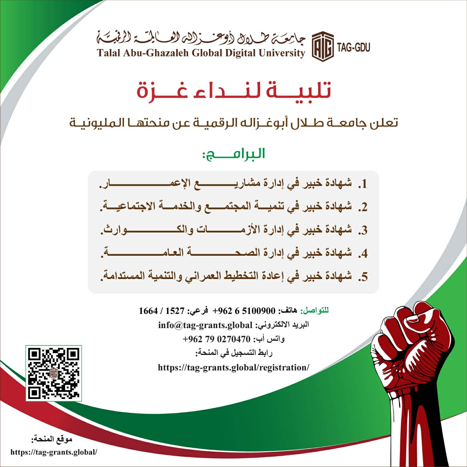 تواصل جامعة طلال أبوغزاله العالمية الرقمية استقبال طلبات الراغبين بالانضمام إلى برامج تأهيل الخبراء في مجالات إعادة الإعمار في المناطق المتضررة من الحروب والنزاعات، لا سيّما في قطاع غزة الذي يتعرّض لحرب إبادة جماعية منذ ما يزيد على العامين.