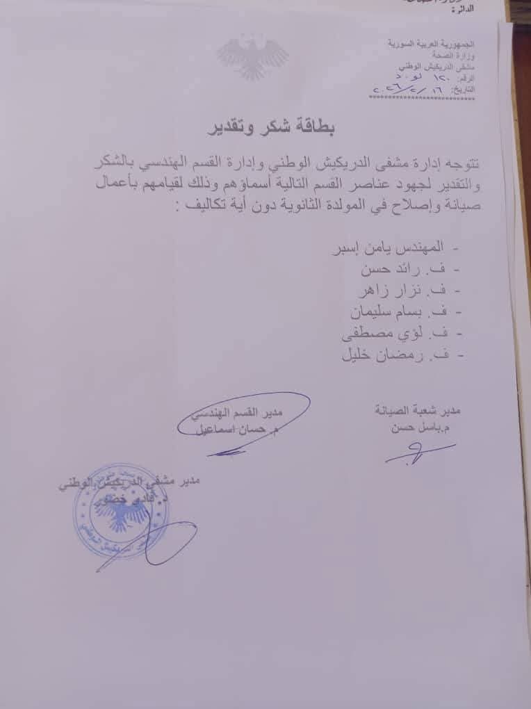 وجّه السيد مدير صحة طرطوس الدكتور علاء البرهوم بطاقة شكر وثناء لعناصر القسم الهندسي في مشفى الدريكيش الوطني، على جهودهم المقدمة لإنجاز أعمال الإصلاح والمتابعة والدراسات والصيانة، وتميزهم في جودة الأداء والالتزام في العمل.