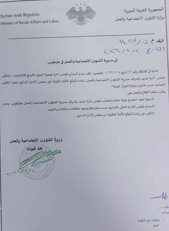 طلبت وزيرة الشؤون الاجتماعية والعمل هند قبوات من مديرية الشؤون الاجتماعية والعمل بطرطوس بكتابها رقم 1427 تاريخ 2-2-2026 الدعوة لعقد اجتماع هيئة عامة لجمعية البتول للخدمات الإنسانية بطرطوس وانتخاب مجلس إدارة جديد لها بإشراف المديرية وعدم السماح لمجلس الإدارة الحالي بالترشيح لوجود مخالفات مرتكبة من قبلهم
