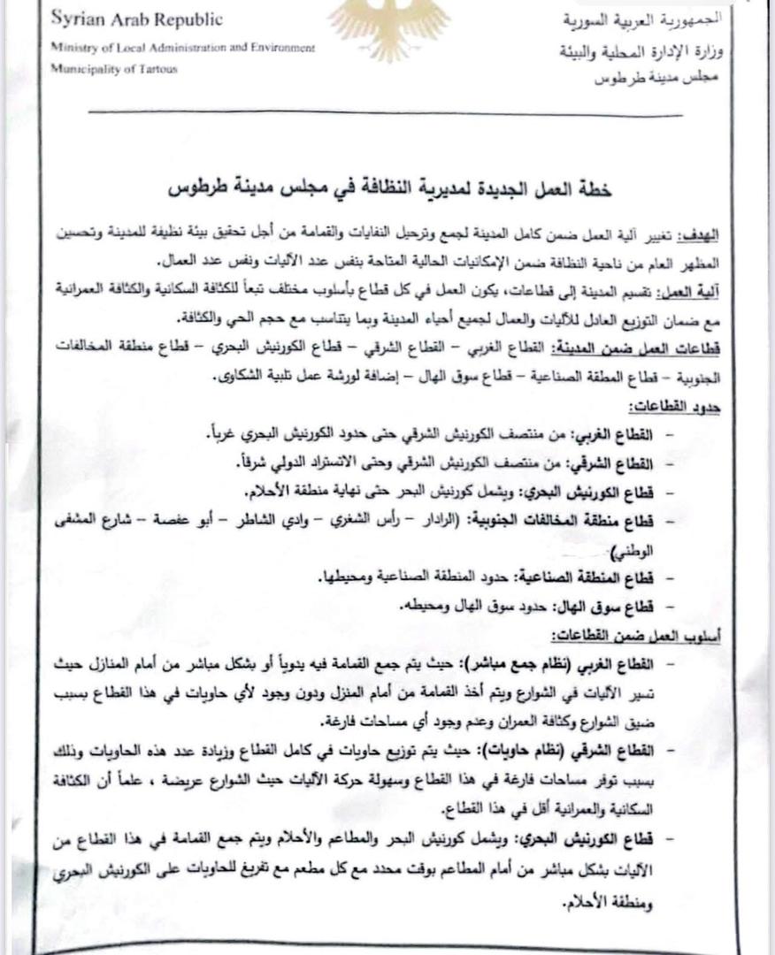 وضع مجلس مدينة طرطوس خطة عمل جديدة تهدف إلى رفع مستوى النظافة العامة وتحسين ظروف الحياة للمواطنين، عبر تحسين وتطوير آلية جمع وترحيل النفايات في المدينة وتحقيق بيئة نظيفة ومظهر حضاري يتناسب مع حجم المدينة ومتطلباتها. مع مراعاة الإمكانيات المتاحة حالياً من حيث عدد الآليات والعمال.