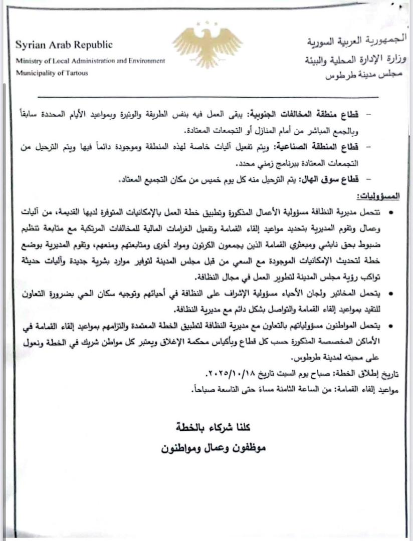 . يتحمل المواطنون مسؤولياتهم بالتعاون مع مديرية النظافة لتطبيق الخطة المعتمدة والتزامهم بمواعيد إلقاء القمامة(من 8 مساءً حتى 9 صباحاً )في الأماكن المخصصة المذكورة حسب كل قطاع وبأكياس محكمة الإغلاق ويعتبر كل مواطن شريك في الخطة ونعوّل على محبته لمدينة طرطوس