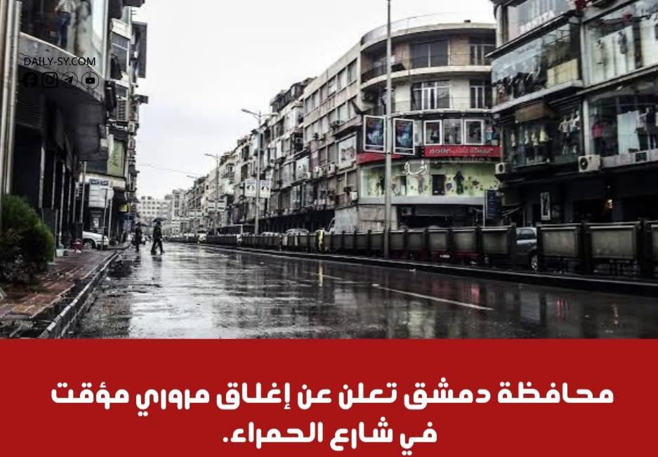 في الغضون، أعلنت محافظة دمشق عن إغلاق مروري مؤقت لجزء من شارع الحمراء، وتحديداً المقطع الممتد من دوار عرنوس وصولاً إلى تقاطع العابد، موضحة أن هذا الإجراء ضروري لتنفيذ أعمال استبدال خط الصرف الصحي في المنطقة.