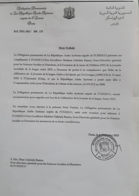 أرجو ان تعترف بحقي في الريادة الفكرية ليوم اللغة العربية العالمي علماً ان مندوبة سوريا في اليونسكو خاطبت المنظمة بكتاب رسمي عام 2022 بريادتي للفكرة