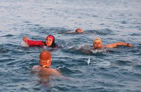 في حين يجمع مدرب السباحة محمد مهرة متدربيه، يلامسون مياه البحر الباردة، ويؤدون تمارين اللياقة البدنية مع انعكاس خيوط الشمس المشرقة على وجوههم.