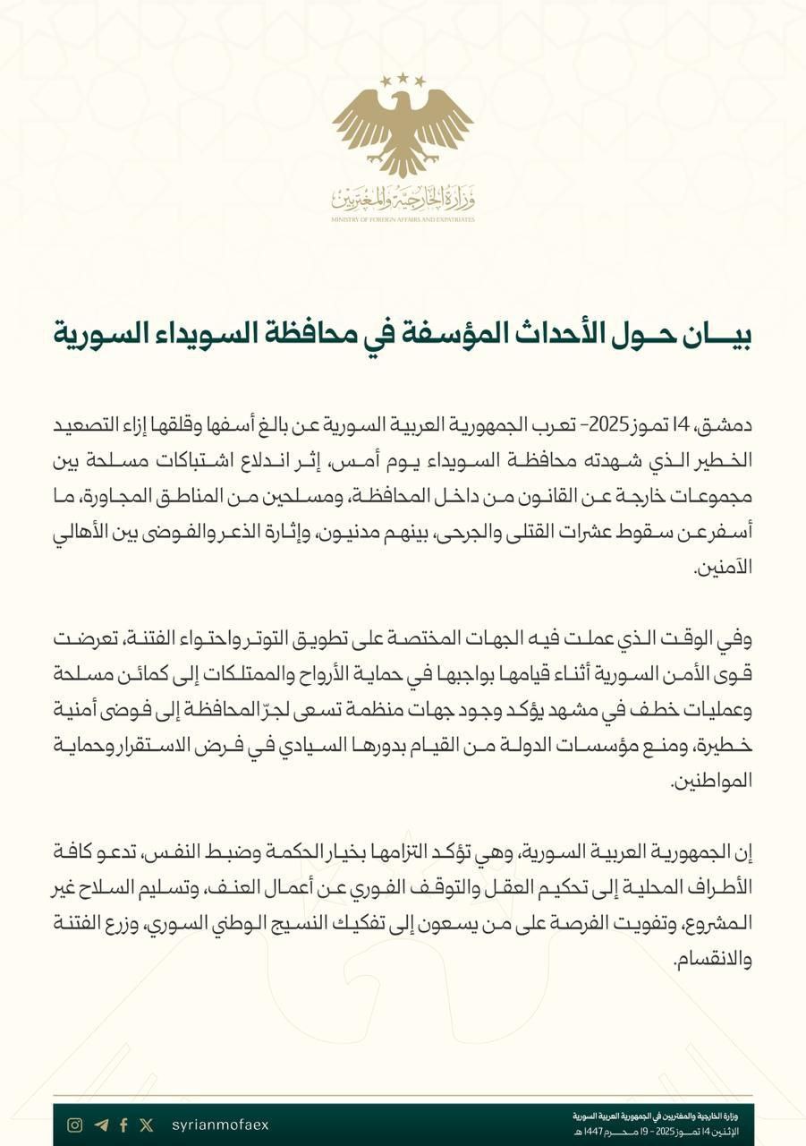 دعت الدولة السورية جميع الأطراف المحلية في السويداء إلى التوقف الفوري عن أعمال العنف، وتسليم السلاح غير المشروع، وتفويت الفرصة على الساعين إلى الفتنة، مؤكدة أنها ماضية في حماية جميع المواطنين دون استثناء، في إطار دولة القانون والسيادة الوطنية.