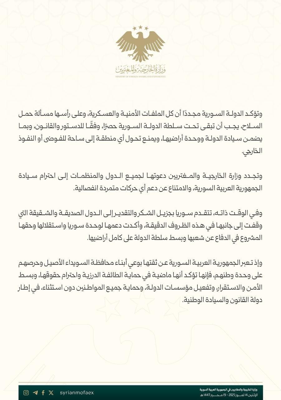 وقالت: وإذ تعبّر الجمهورية العربية السورية عن ثقتها بوعي أبناء محافظة السويداء الأصيل وحرصهم على وحدة وطنهم، فإنها تؤكد أنها ماضية في حماية الطائفة الدرزية واحترام حقوقها، وبسط الأمن والاستقرار، وتفعيل مؤسسات الدولة، وحماية جميع المواطنين دون استثناء، في إطار دولة القانون والسيادة الوطنية.