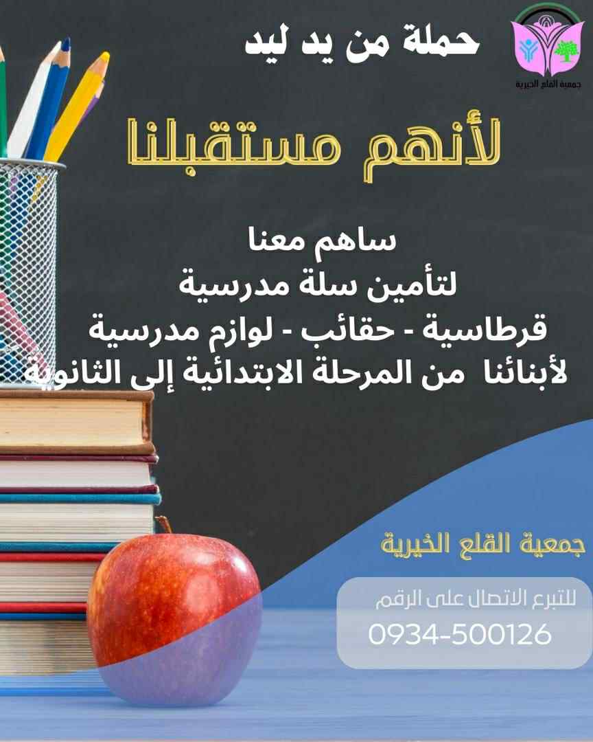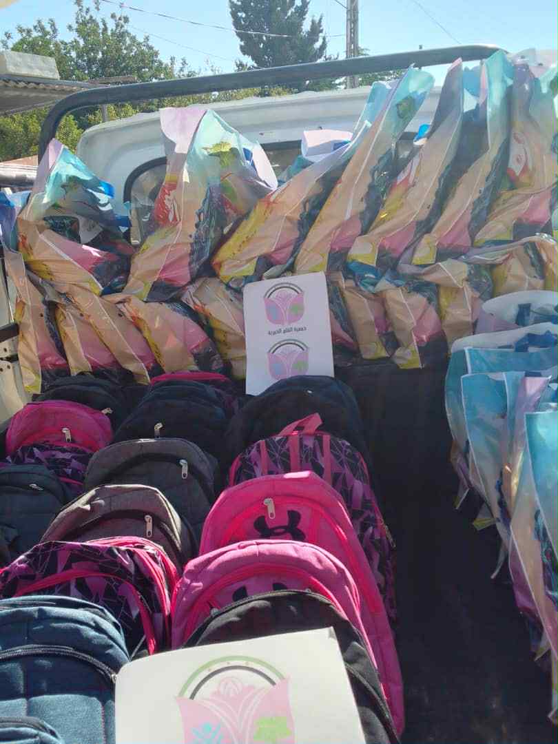 وفي ضوء التزامها بدعم الطلاب قامت بالتعاون مع عدد من اصحاب الأيادي البيضاء وبمجهود من كادر العمل بتوزيع 295 سلة مدرسية تضم حقائب ودفاتر وقرطاسية وشمل التوزيع قرية مقر الجمعية (قلع الصويري)واليتامى والأشد فقراً في القرى المجاورة ” شباط . مرسحين . حبابة .الجراص . ضهر حمين . بيت الجهني . بجمرة” . وبعض الطلاب في طرطوس وصافيتا والدريكيش وبانياس والرادار ودوير الشيخ سعد والشيخ بدر