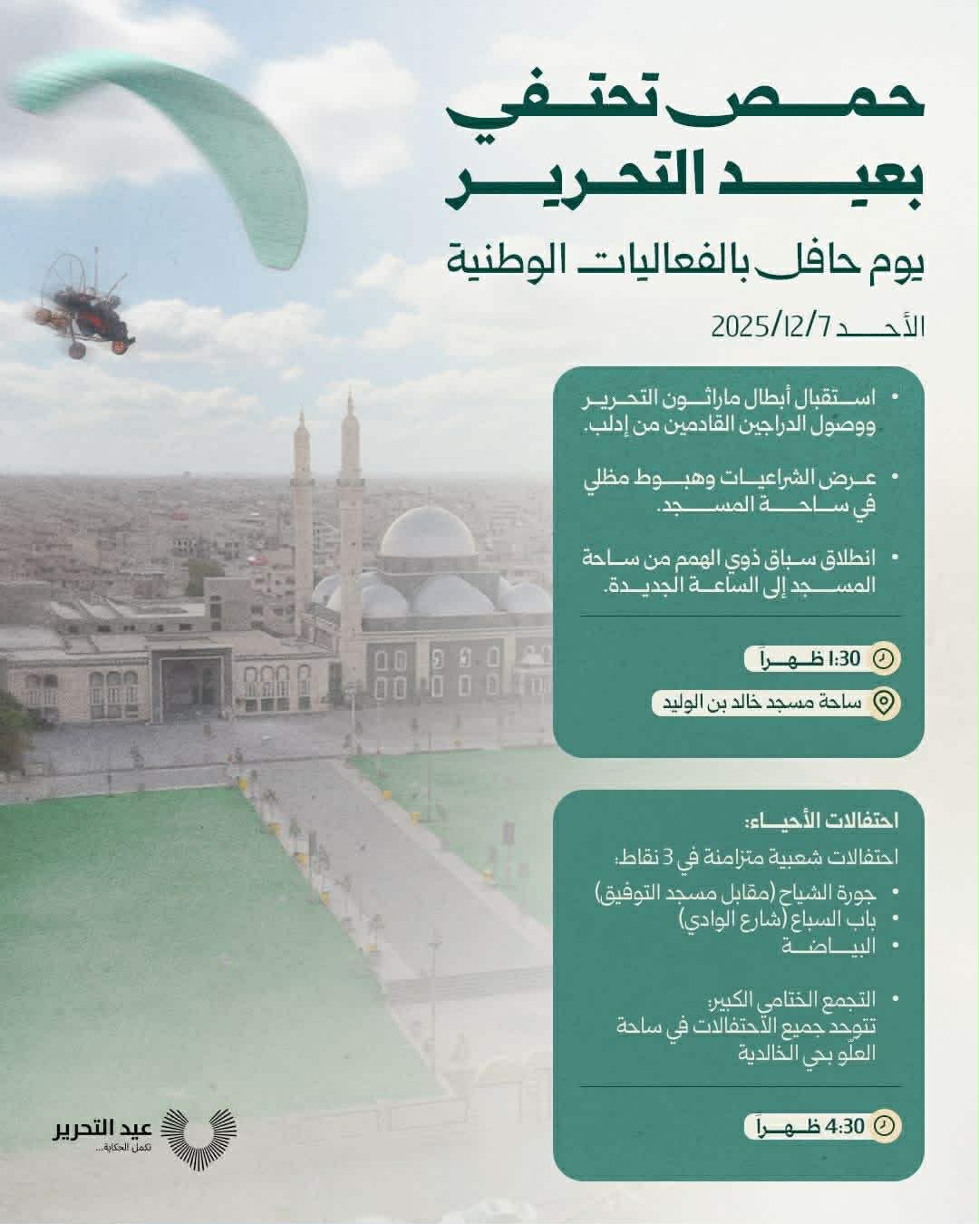 وذكرت المحافظة على صفحتها الرسمية ان الفعاليات تنطلق عند الساعة 1:30 ظهراً في ساحة مسجد خالد بن الوليد، باستقبال أبطال ماراثون التحرير والدراجين القادمين من إدلب، يتبع ذلك عرض الشراعيات والهبوط المظلي، ثم انطلاق سباق ذوي الهمم من ساحة المسجد باتجاه الساعة الجديدة.