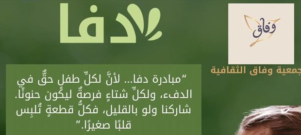 أطلقت جمعية “وفاق الثقافية” مبادرة “دفا” إيماناً منها بأن لكل طفل الحق في الدفء، ولكل شتاء فرصة ليكون حنوناً، مخاطبة المتبرعين بالقول: “شاركنا ولو بالقليل، فكلُّ قطعة تُلبس قلباً صغيراً”.