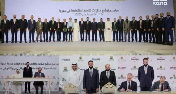 بحضور الرئيس الشرع، توقيع اتفاقية استراتيجية بقيمة استثمارية 800 مليون دولار بين الهيئة العامة للمنافذ والجمارك، وشركة موانئ دبي العالمية لاستثمار وتشغيل وتوسيع وإدارة ميناء طرطوس، وتطوير بنيته التشغيلية واللوجستية بما يتوافق مع المعايير الدولية.
