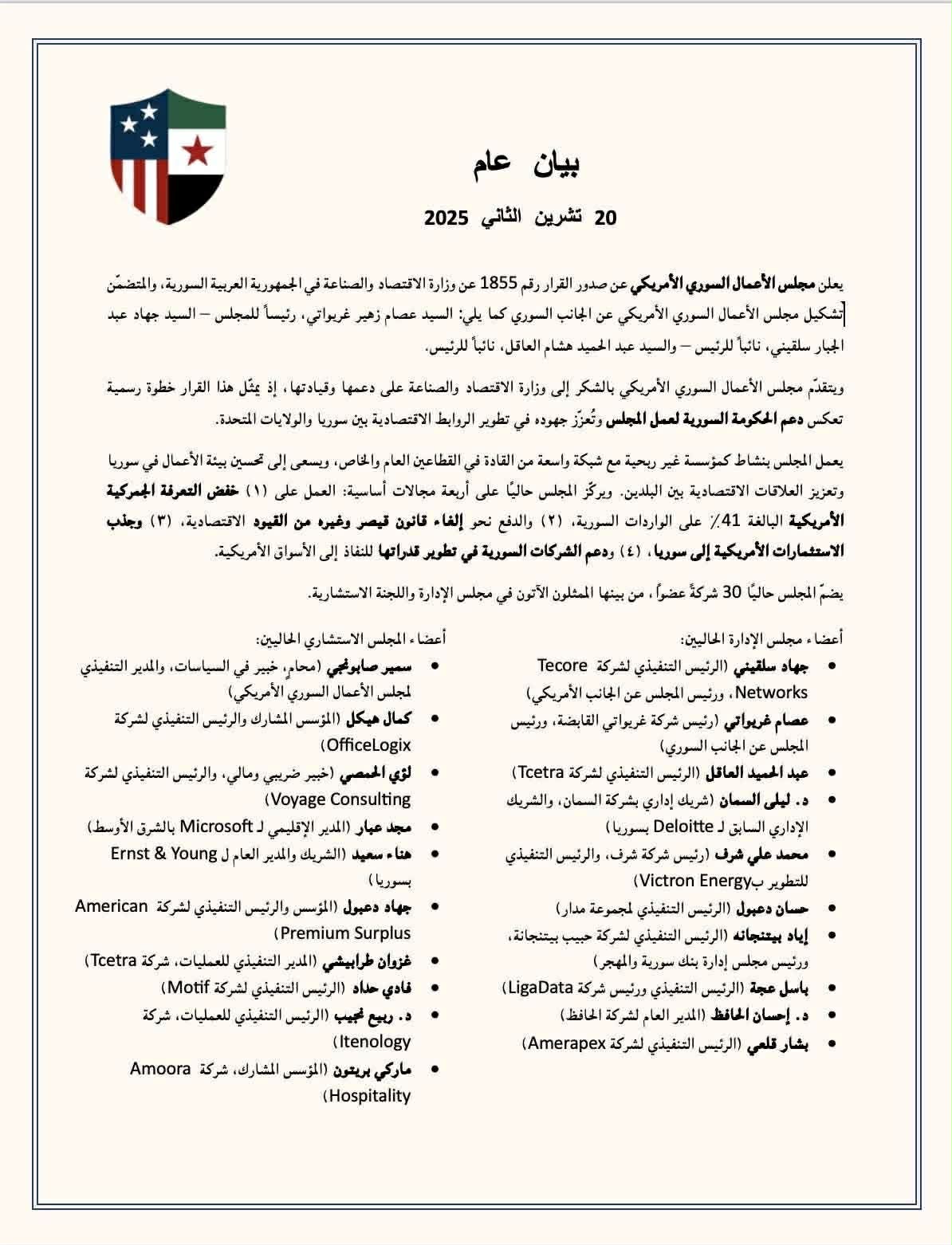 اصدر مجلس الأعمال السوري الأمريكي بياناً اعلن فيه صدور القرار رقم 855 عن وزارة الاقتصاد والصناعة في الجمهورية العربية السورية، والمتضمّن تشكيل مجلس الأعمال السوري الأمريكي عن الجانب السوري من السادة:عصام زهير غريواتي، رئيساً للمجلس – جهاد عبد الجبار سلقيني، نائباً للرئيس – وعبد الحميد هشام العاقل، نائباً للرئيس.